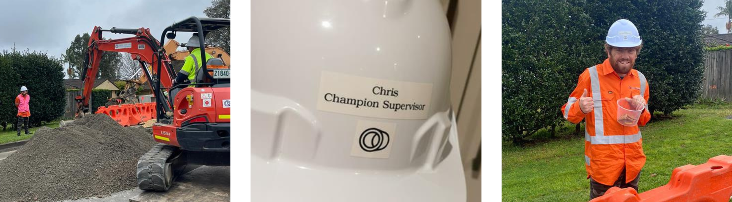 Adam Flynn, Director of our delivery partner Pipeline Install NSW noticed Chris' interest and warmly introduced himself. Inspired by Chris' excitement and eagerness to learn, Adam was keen to find ways to safely include him in the action. With the team's support, Adam invited Chris to attend the project's pre-start meetings at 6:45 am each day. He also gifted Chris some personal protective equipment (PPE), including a high visibility uniform, safety boots and a hard hat with the title, 'Champion Supervisor".